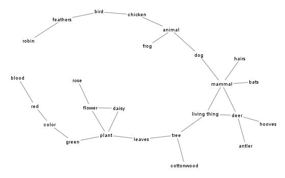 This is another network derived from the same data as the first one. this time the network is PFnet(n-1, infinity). It was produced with the Java version of thw software (JPathfinder.jar). This network has all of the links that would be found in any mimimum spanning tree of the complete network corresponding to the proximity data. In this case there are two minimum spanning trees. One would result from removing the link between "living thing" and "mammal." The other would result from removing the link between "living thing" and "deer." Both links are included in the Pathfinder network because they have the same proximity value. Also note that the first network has all of the links shown here as well as some additional links that are included when the q parameter is equal to 2.