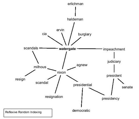 Here is a PFNet(n-1,infinity) of the 20 nearest neighbors of Watergate derived using Reflexive Random Indexing on the Touchstone Applied Sciences (TASA) Corpus.